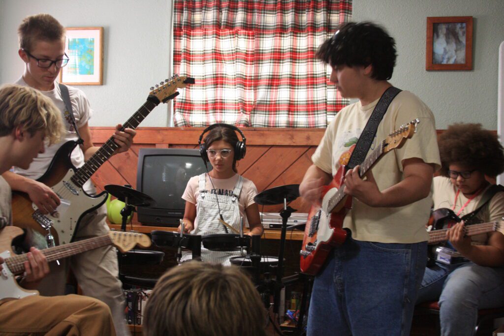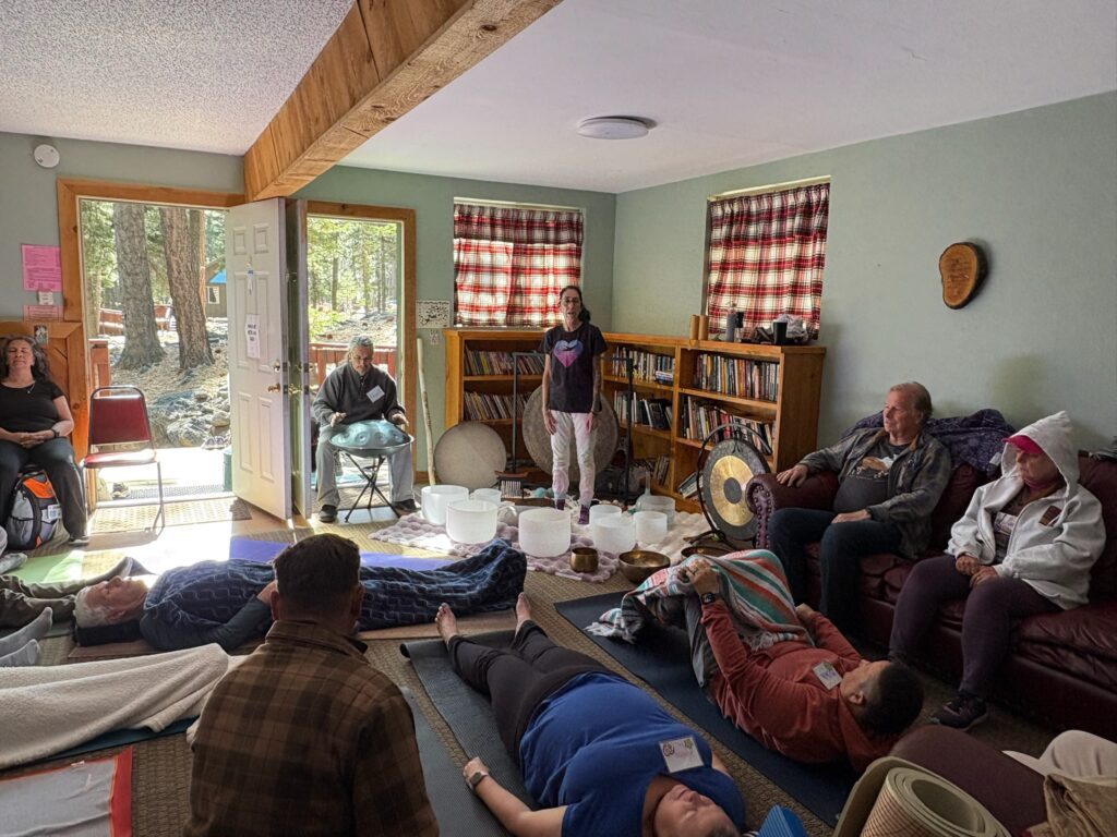 The charming PSWIRL* building houses a diverse library of books and movies. You can use it for meetings, discussions, reading, writing, or film watching. The cozy cabin contains two rooms, a wraparound sofa, reading chairs, a writing desk, and two bathrooms. PSWIRL is an intimate setting for camp scheduled workshops and activities. It is also a comfortable place to spend a calm and productive day.